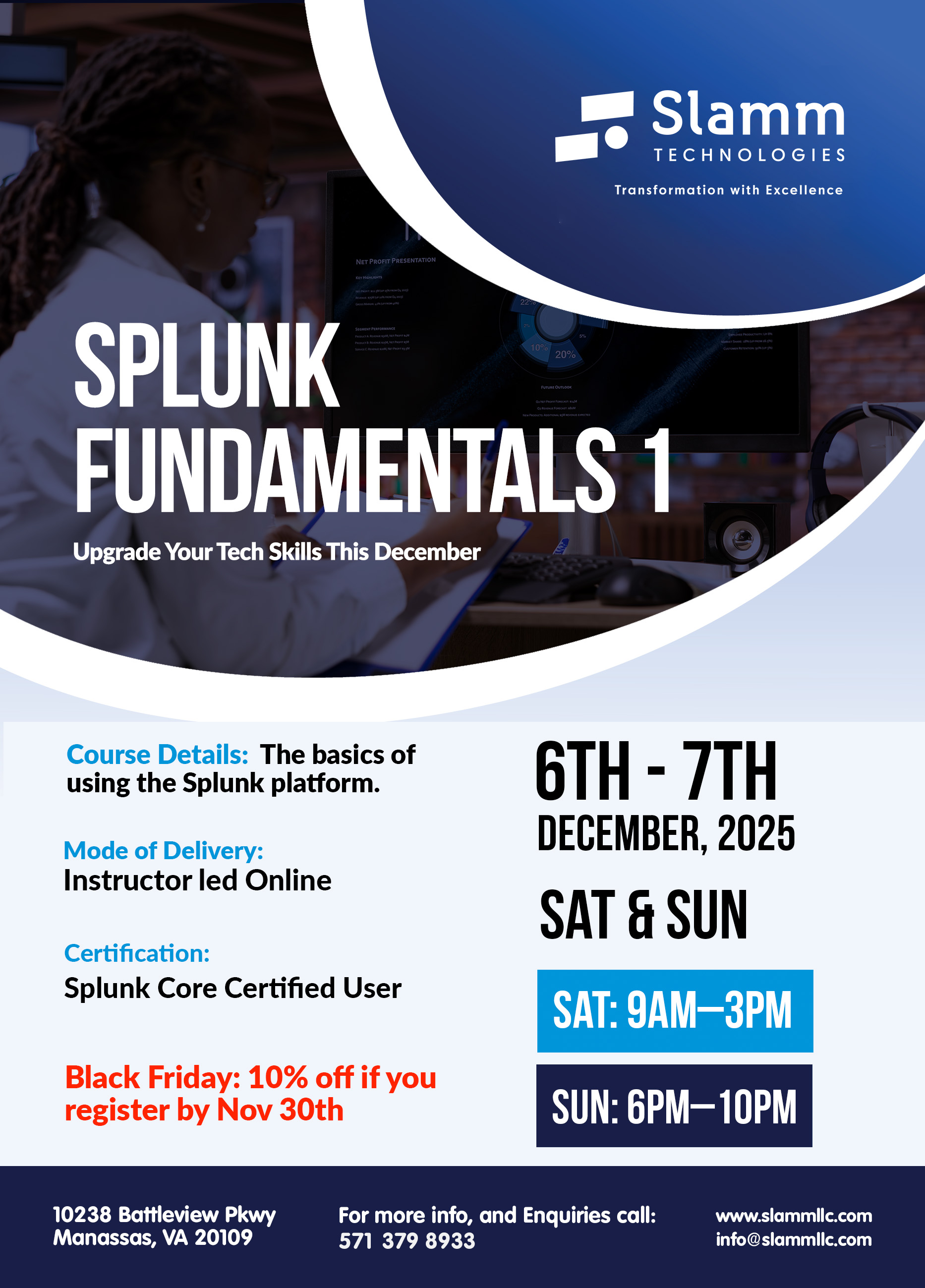 | Splunk Fundamentals 2 | Go deeper into Splunk. Learn to capture, index data, and create graphs, reports, alerts, dashboards, and visualizations. | You must complete Splunk Fundamentals 1 first. | Splunk Core Certified Power User. | Splunk Power User, Data Analyst, IT Operations Analyst, Junior Security Analyst, or System/BI Analyst (entry-level). | Saturday, 12/13 and Sunday, 12/14 | Saturday: 9 AM - 3 PM and Sunday: 6 PM - 10 PM | $999. Get 10% off with our Black Friday sale if you register by 11/30. |