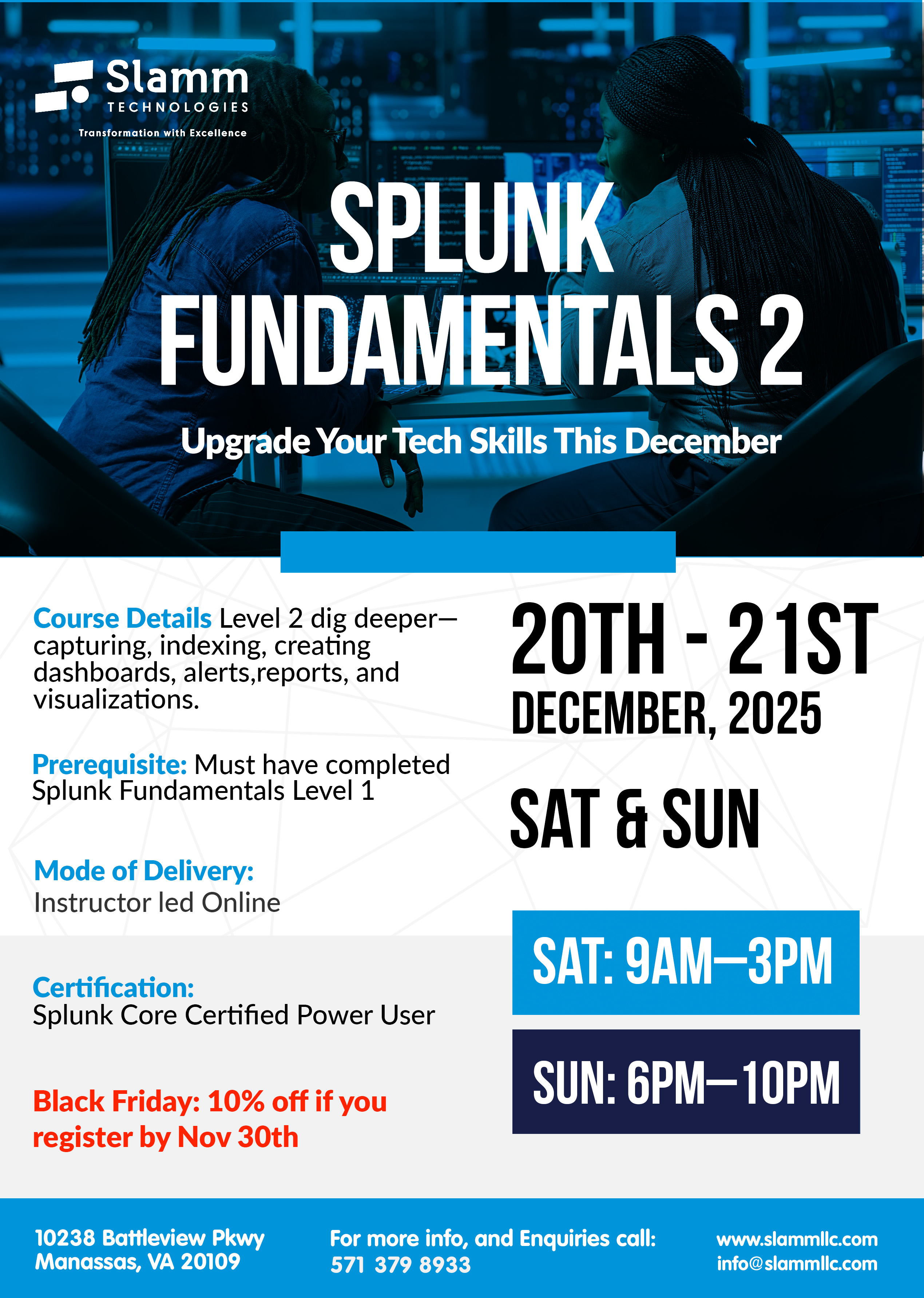 | Splunk Fundamentals 2 | Go deeper into Splunk. Learn to capture, index data, and create graphs, reports, alerts, dashboards, and visualizations. | You must complete Splunk Fundamentals 1 first. | Splunk Core Certified Power User. | Splunk Power User, Data Analyst, IT Operations Analyst, Junior Security Analyst, or System/BI Analyst (entry-level). | Saturday, 12/20 and Sunday, 12/21 | Saturday: 9 AM - 3 PM and Sunday: 6 PM - 10 PM | $999 |